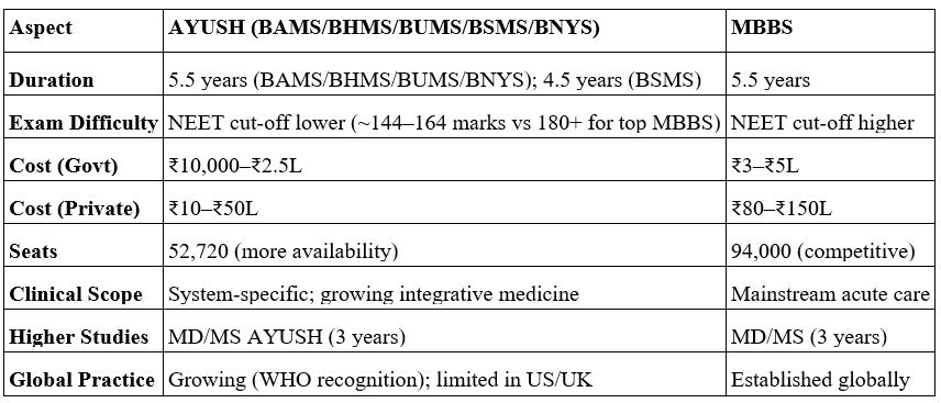 ✅ More Seats: 52,720 AYUSH seats vs 94,000 MBBS (less competition per available seat)