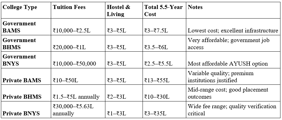 Recommendation: Government college AYUSH offers exceptional ROI; premium private justified only if placement >85% and average package ₹5L+.