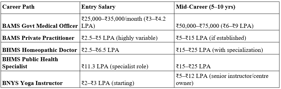 Top Recruiters: AYUSH Ministry, Medical colleges (teaching), Private hospitals, Wellness centers, Pharmaceutical companies, Corporate wellness programs, Government health schemes (Ayushman Bharat)